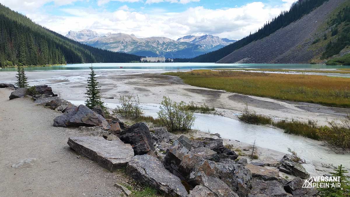 En ce lundi matin, nous nous sommes rendus au Lac Louise très tôt. Étant donné qu’il n’y avait pas trop de gens encore, nous avons pu prendre quelques photos. Nous avons ensuite commencé notre randonnée en marchant le long du Lakeshore Trail, sentier qui se situe à droite lorsqu’on fait face au lac. Le départ de Plain of Six Glaciers débute donc juste à la fin de celui-ci.