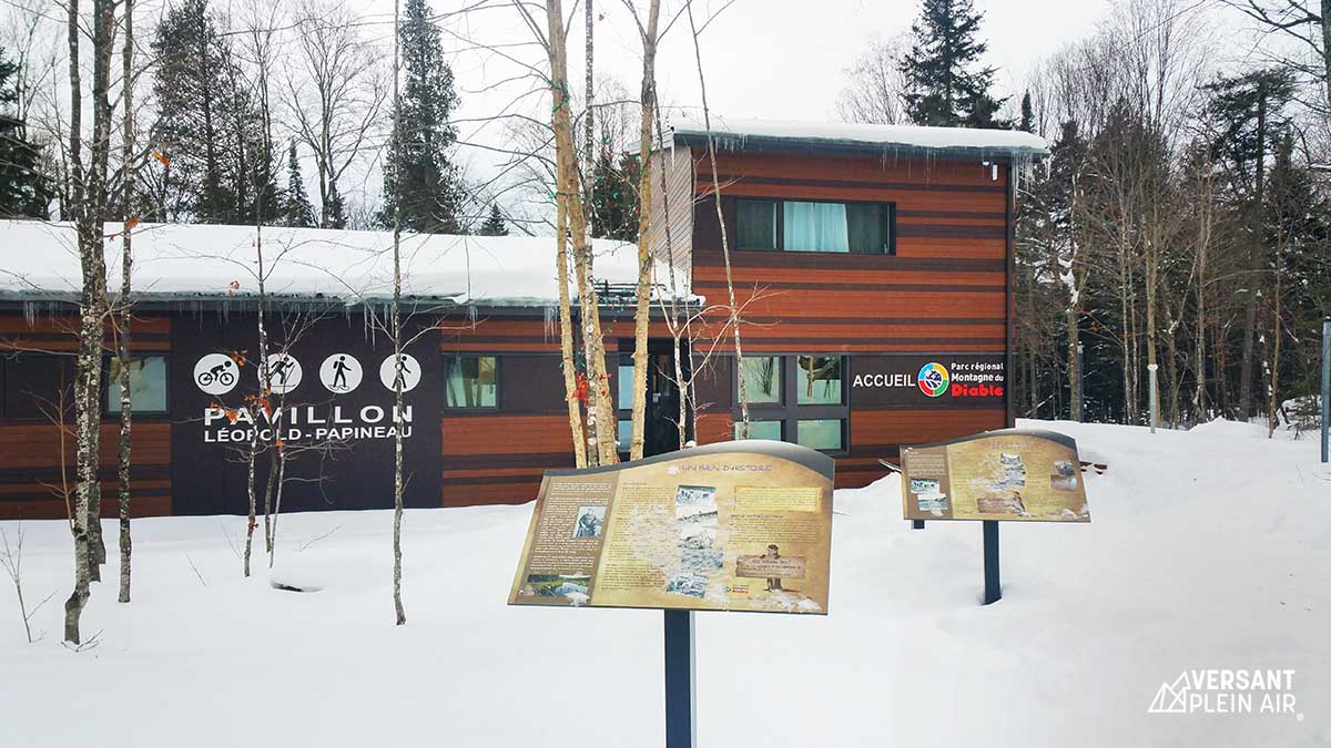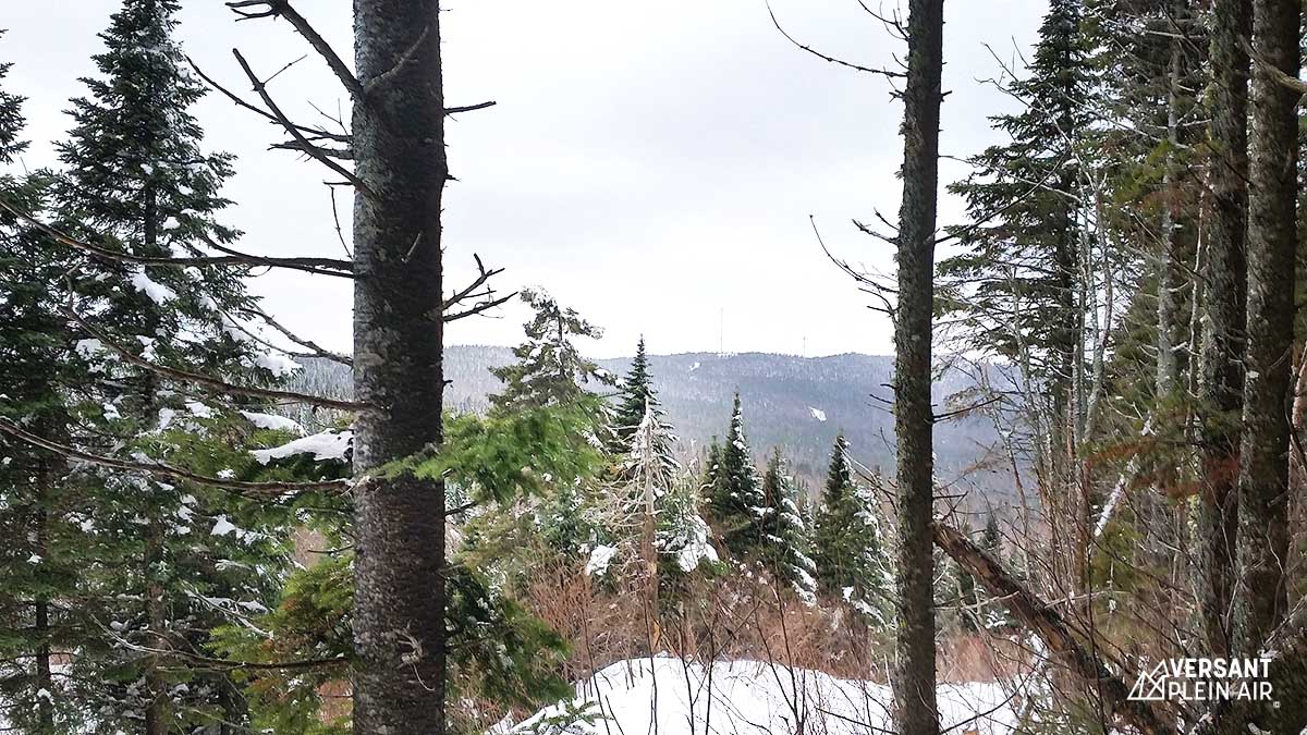 Pour notre deuxième journée, notre objectif était de compléter la boucle des quatres sommets. Puisqu’il y avait eu un peu de verglas la veille, la neige était plutôt dure et dans les sentiers non tracés. Le défi devenait plus grand. Nous avons quand même traversé de la Paroi de l’Aube jusqu’au sommet du Garde-Feu (756 m). Ensuite, en continuant notre chemin, nous avons croisé l’intersection pour se rendre à L’Halte-titude (un resto/bar ouvert l’hiver). Même si l’on était curieux de cet endroit, on a décidé de poursuivre notre route puisqu’on avait peur de terminer notre randonnée trop tard.