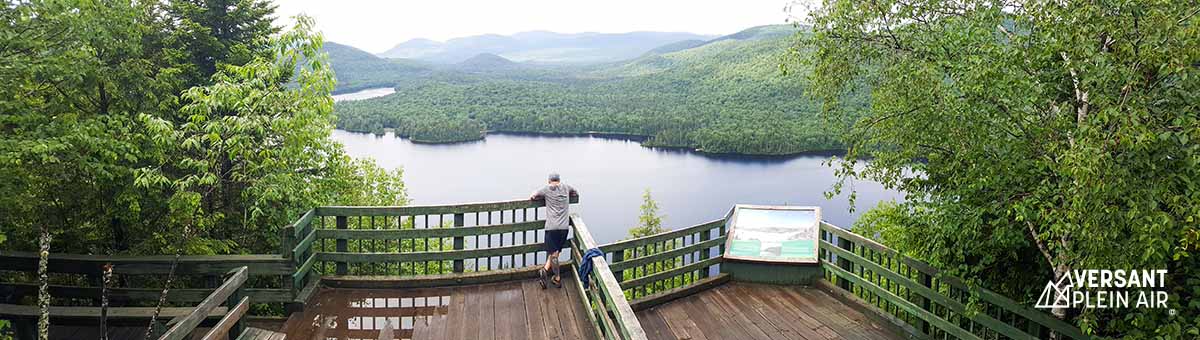 Le départ se fait à partir du stationnement de La Roche, situé à 200 mètres du Centre des Découvertes. Le sentier est aménagé et large. La montée est constante, mais progressive et plutôt facile. À un endroit, ou deux, ça devient un peu plus abrupt. Nous sommes arrivés au belvédère après seulement 35 minutes. Pour une si petite randonnée, la vue est impressionnante. On peut y voir de nombreuses montagnes, dont le sommet du Mont-Tremblant, le pic Johansson, ainsi que le lac Monroe. Après quelques moments passés en haut, nous sommes revenus sur nos pas sur 200 m pour ensuite prendre le sentier La Coulée.