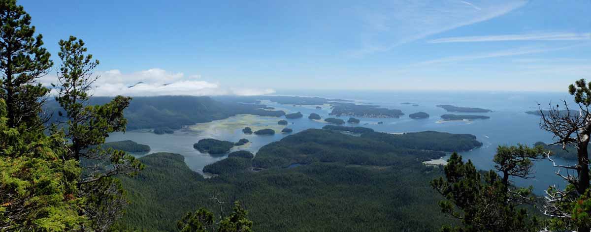 Pendant toute la randonnée, nous étions plongées au cœur de la forêt humide tempérée. La végétation est très verte et principalement constituée d’impressionnants grands arbres, notamment de magnifiques cèdres. Après quelques heures de montée, la vue au sommet est spectaculaire et console vraiment tous nos efforts. On peut voir l’ensemble de la baie Clayoquot, classée comme réserve de biosphère par l’UNESCO. On peut aussi apercevoir, au loin, la ville de Tofino.