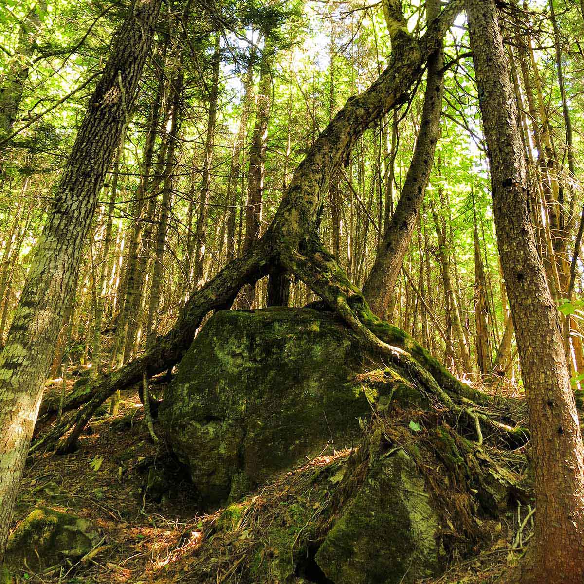 La randonnée commence par une ascension de 1,5 km dans une érablière et à travers des affleurements rocheux. Le sentier des Parois (sentier n°8) nous offre un premier point d’intérêt. En effet, on y côtoie d’immenses épinettes protégées par des rochers tranchés au couteau.