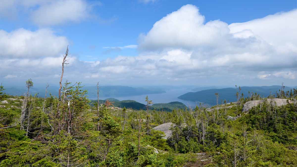 Un peu plus loin, on arrive à un joli belvédère qui offre un beau point de vue sur le village de l’Anse-Saint-Jean. La randonnée continue dans la forêt boréale, avant d’arriver face au « Lac Mort », que l’on contourne par un chemin de pierres. Enfin, le sentier qui était jusqu’à présent assez plat commence à être plus escarpé, jusqu’au sommet. Mais la montée en vaut la peine ! L’arrivée en haut de la montagne Blanche est une expérience assez extraordinaire. Ce sommet dénudé, au paysage digne de la toundra, offre une superbe vue à 360° sur le fjord et les environs. Et le petit plus, selon la saison, est qu’on peut y trouver des bleuets ou des canneberges en abondance. Attention à bien suivre les pastilles jaunes installées au sol pour ne pas vous perdre sur l’immensité de ce sommet.