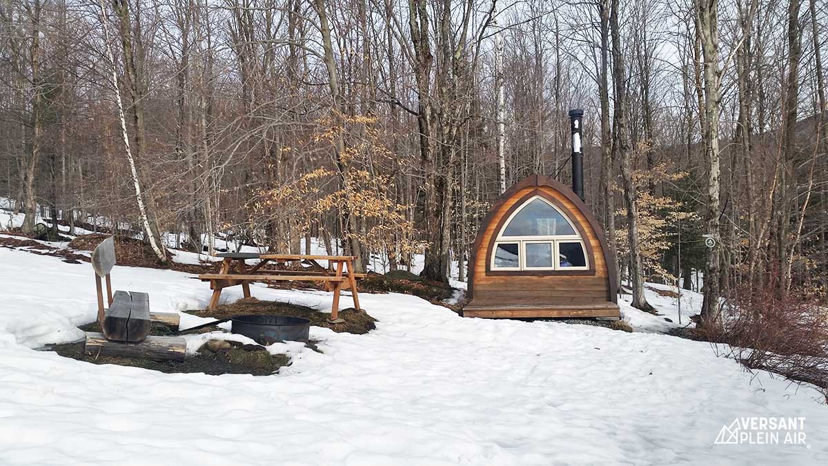 Ces petits pod sont idéals pour un week-end isolé en nature. Conçus pour un couple ou une famille, vous y trouverez votre intimité, tout en profitant des nombreuses activités plein air entourant le domaine. Dans chaque pod, on y retrouve entre autres un lit, une table, des chaises et un poêle à bois. La distance à parcourir n’est que de quelques centaines de mètres à partir du stationnement, où se trouve aussi le bâtiment de commodités. Il y a tout de même des toilettes sèches près de chaque refuge pour les envies plus pressantes.