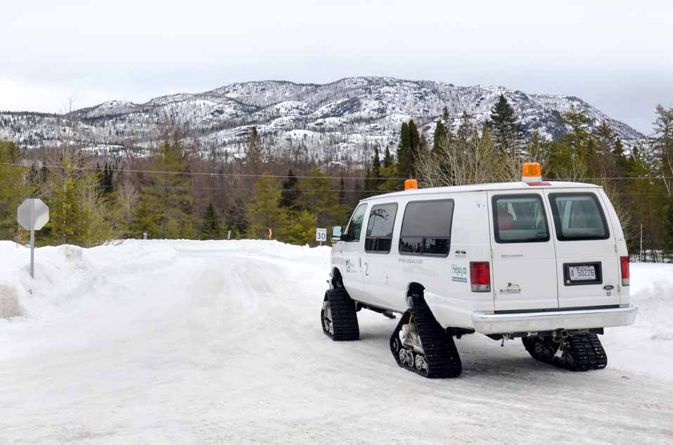 Pour se rendre à la Vallée des Fantômes, le rendez-vous est donné au Centre d’interprétation et de services du parc des Monts-Valin. De là, le Fantôme express, petite van montée sur des chenilles à neige, vient nous chercher pour nous emmener jusqu’au sentier dans le secteur de la baie d’Alexis. Après 30 bonnes minutes de route, la navette nous dépose au début. C’est ici que commence l’ascension vers le Pic Dubuc, raquettes aux pieds. La navette reviendra nous chercher après 5 heures, ce qui donne une plage horaire assez large pour faire la randonnée à un rythme tranquille.