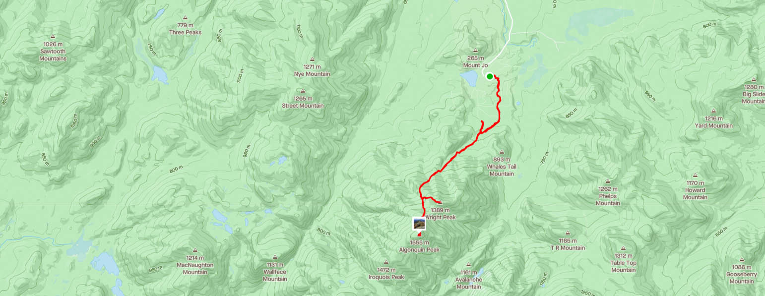 Après avoir pris une longue pause, nous sommes redescendues par le même sentier. La descente était plus dangereuse que la montée puisque le chemin était encore très glacé abrupt. Un faux pas et l’on pouvait vite tomber et se ramasser quelques pieds plus bas, sur les fesses. À l’intersection du mont Wright, cette fois-ci, nous avons décidé de grimper. L’ascension n’est pas très longue (environ 600 m), mais elle est assez à pic. Nous nous sommes à nouveau reposées en haut, avec une vue directe sur le sommet d’Algonquin, et nous sommes redescendues.