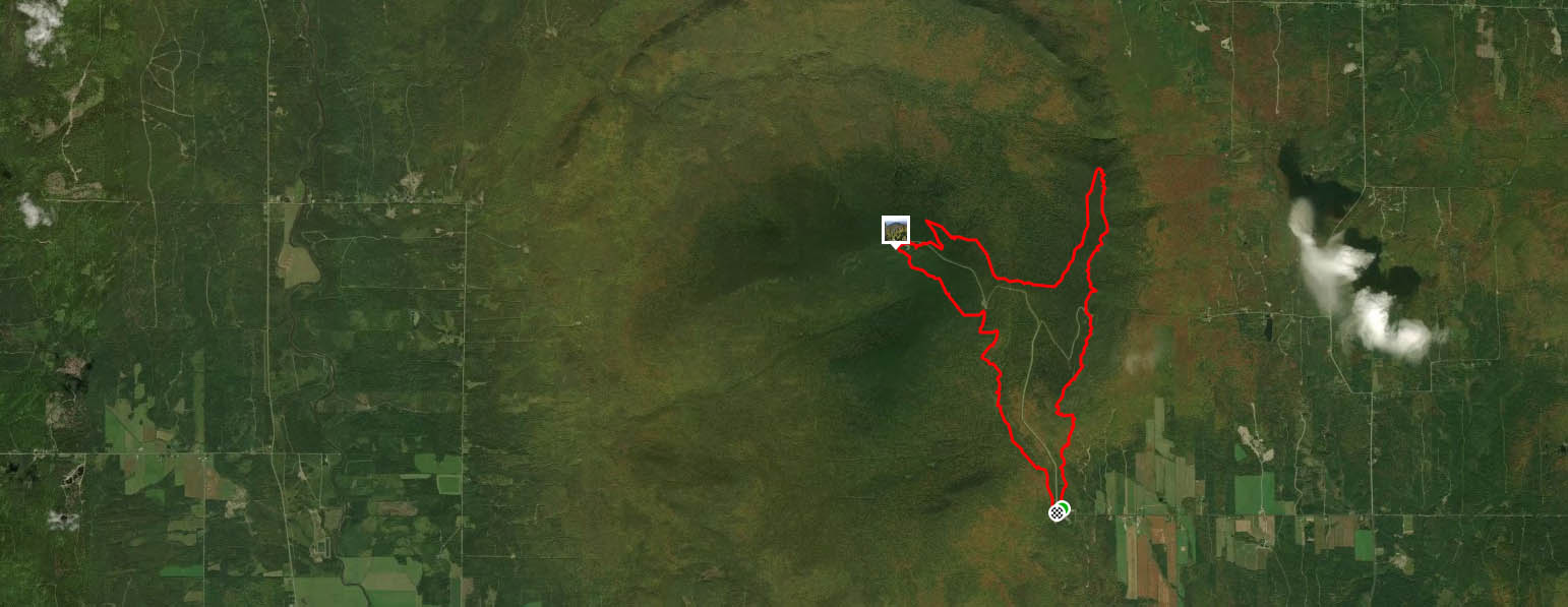 Le départ se trouve tout près du pavillon des Découvertes, de l’autre côté de la route. Nous avons commencé l’ascension en pleine forêt, sur un sentier accidenté et assez abrupt. Au bout de quelques minutes seulement, nous avons atteint un premier point de vue. Le paysage et la vue dégagée étaient à couper le souffle, et nous n’avions même pas atteint le premier sommet encore. Nous avons d’abord rejoint le refuge des Pèlerins. Après 1 h 30 min et 3,2 km, nous sommes finalement arrivés au mont Saint-Joseph (1065 m). Là-haut, on y trouve une petite chapelle, une gigantesque croix, un abri, une tour de télécommunications et un champ d’Inukshuk. Des panneaux d’informations nous pointent les différents sommets que l’on aperçoit au loin (dont Kathadin), et l’on nous indique que de nombreux visiteurs participent encore au pèlerinage qui a lieu annuellement au mois d’août.