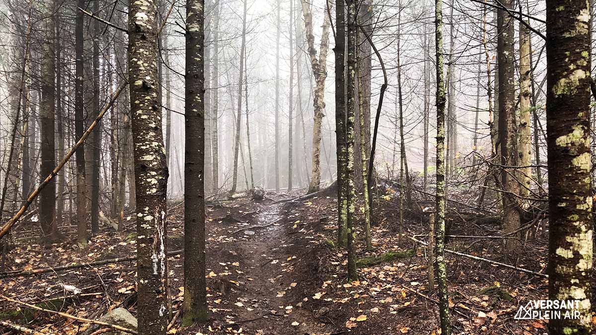 Ce dimanche gris d’automne là, en se dirigeant vers la montagne, ma sœur, mon amie Catherine et moi-même, on s’est dit qu’on allait peut-être s’en sortir avec quelques petits éclaircis. Malheureusement, en arrivant au stationnement, nous nous sommes vite rendu compte que ça serait une randonnée dans les nuages, sans point de vue. Nous sommes restées positives tout de même, en nous disant qu’au moins, il ne pleuvait pas trop.