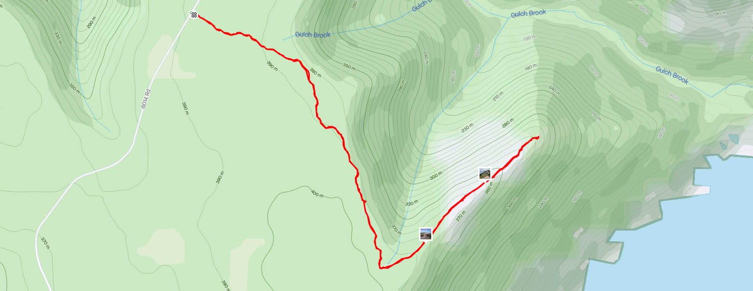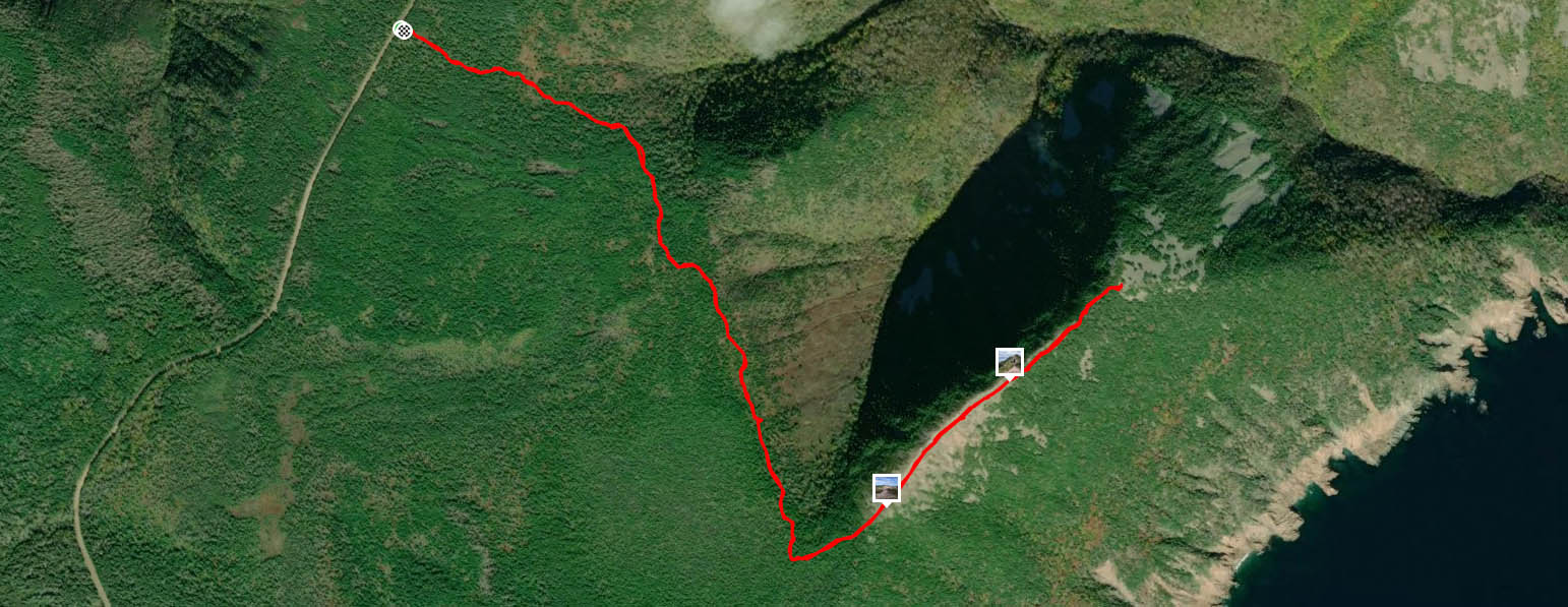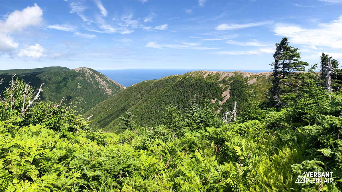 Bien qu’il n’y ait rien de compliqué dans la randonnée en soi, le trajet en voiture pour s’y rendre est quelque chose d’autre. En quittant la route, juste avant Bay St. Lawrence, il faut parcourir six kilomètres sur un chemin de service en terre et en roche très accidenté. Ce n’est pas du tout adapté aux petits véhicules et je vous déconseille même de le faire. Bref, une fois sur place il est également difficile de repérer le début du sentier, mais une bouée a été accrochée à un arbre afin d’aider. Très vite, on remarque que le chemin n’est pas trop achalandé encore vu son aspect plutôt sauvage. Après seulement 20 minutes sur un terrain plat, on aperçoit finalement la crête à travers les branches.