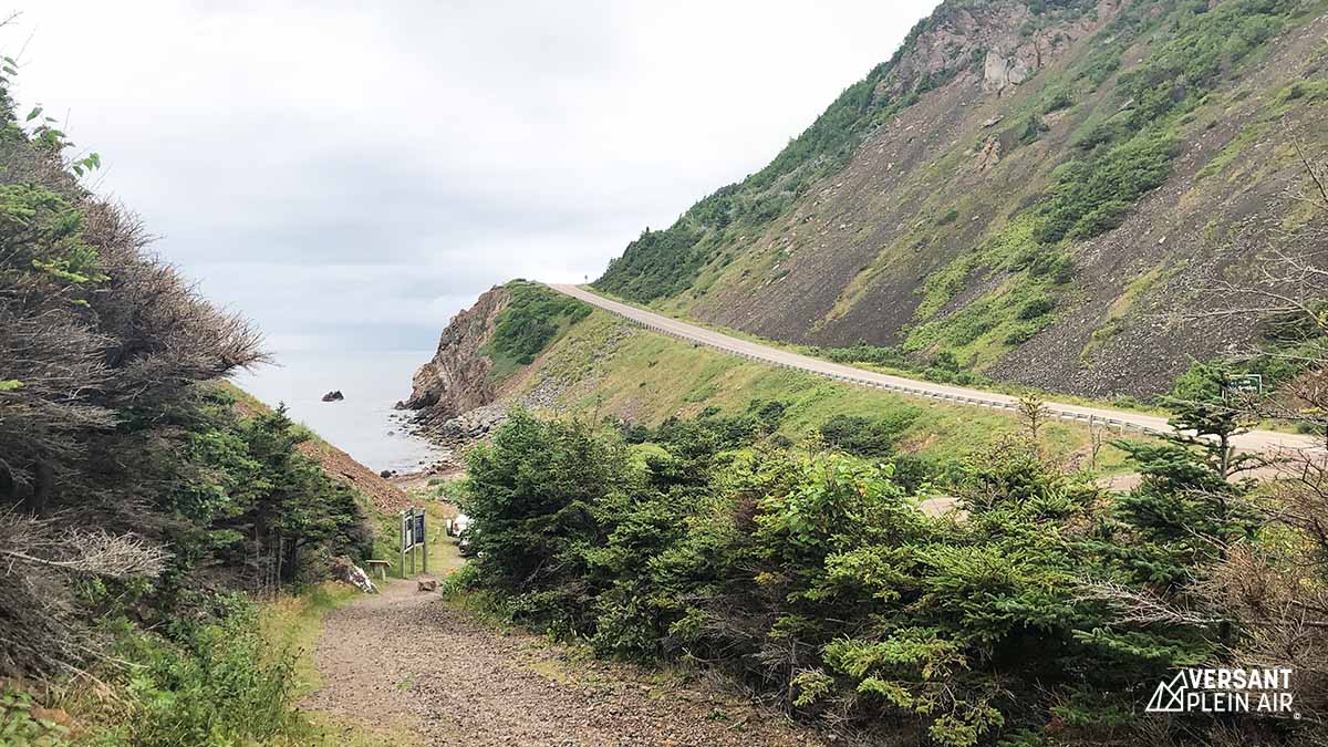 Nous avons donc fait un petit tour de la ville et quand la pluie s’est calmée, nous avons décidé d’aller voir le Buttereau puisque c’était un court sentier. Le stationnement se trouve le long de la Cabot Trail et celui-ci est indiqué par un panneau qu’on ne peut pas manquer. Dès les premières minutes, on se retrouve à grimper une bonne pente, mais le plateau arrive vite. Là-haut, un petit sentier à la droite vous mène à un beau point de vue. En revenant sur ses pas, on récupère le chemin qui se promène à travers clairière et forêt. Quelques panneaux d’interprétation vous racontent l’histoire des anciens habitants du coin. Quelques fondations de bâtiments sont encore présentes.