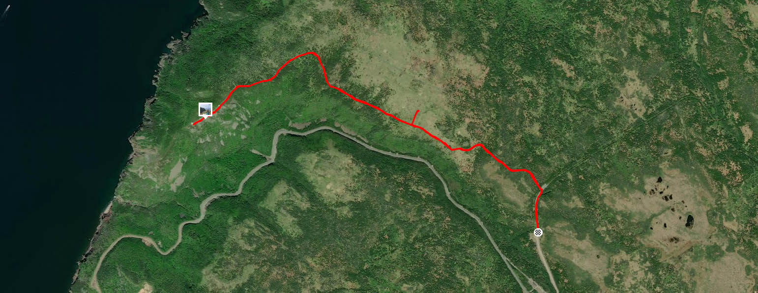 Le sentier débute sur un chemin facile avec un léger faux plat, qui se fait surtout ressentir au retour. La vue est dégagée pour la plupart du temps et l’on peut admirer le haut des montagnes au loin. À mi-chemin, un enclos avec de grandes barrières abrite une petite tour d’observation qui nous sert à épier la faune tout autour.