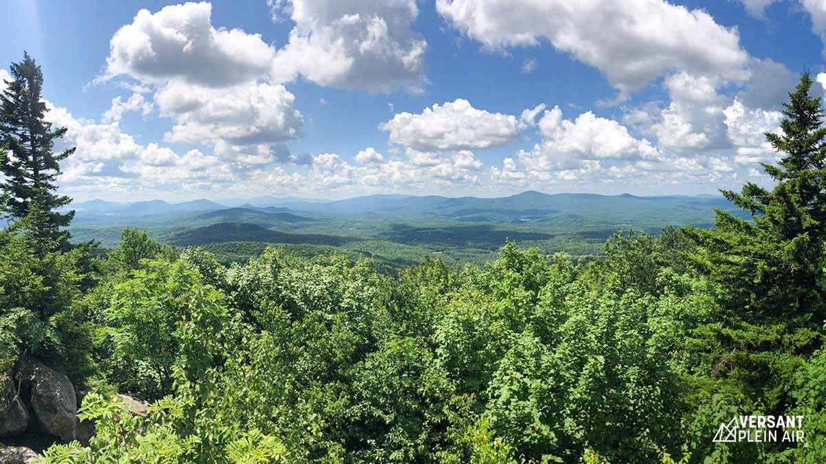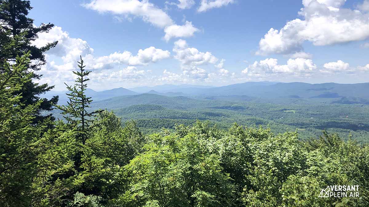 Rendues près du sommet, les indications deviennent moins claires. Il est écrit qu’on approche du point culminant et qu’on croisera également plusieurs points de vue. On décide de prendre la piste qui semble monter encore plus haut. C’est alors qu’on y trouve un cap rocheux avec une vue incroyable ! On se dit qu’on doit être arrivé. Au loin, on observe des dizaines de montagnes, dont Owl’s Head, Sutton et plusieurs autres pics américains.