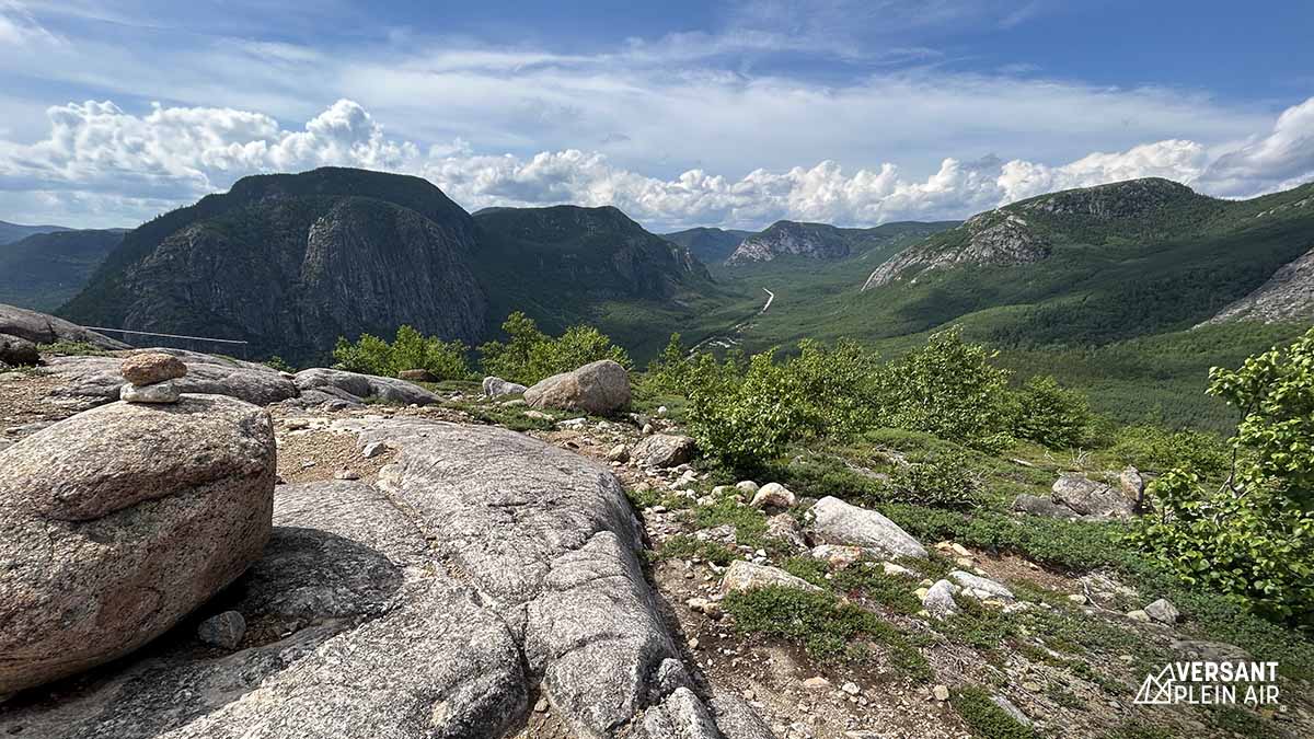 Rendue au sommet, la vue à 360 ° nous fait oublier le sentier moins intéressant. D’un côté se dresse la cime du mont du Lac-des-Cygnes, de l’autre, ce sont les montagnes et l’ancienne vallée glaciaire. Finalement, peu importe où l’on regarde, c’est tout simplement magnifique. Le sommet du mont du Dôme que nous avions franchi plus tôt dans la journée se trouve juste en face quand on suit du regard la route au loin.