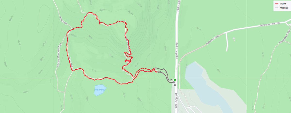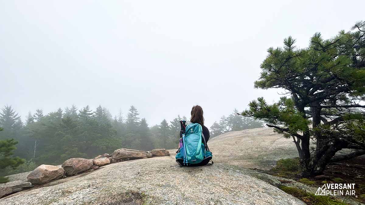 Finalement, nous avons atteint le sommet après une bonne ascension de 150 m en moins de 1 km. Malheureusement, nous n’avons pas eu la chance d’avoir un point de vue dégagé. En temps normal, nous aurions pu observer l’arche de Sand Beach et l’océan au loin. Ensuite, pour revenir au point de départ, nous avons compléter la boucle par le bowl trail. Nous serons certainement de retour éventuellement pour vivre l’expérience Acadia et ses magnifiques paysages non couverts, espérons-le !