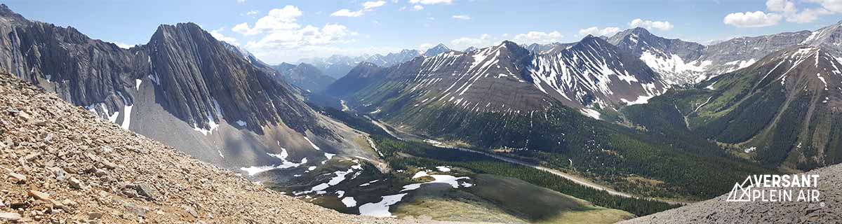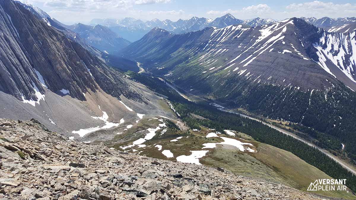 Après avoir admiré l’impressionnant cirque qui nous entourait, nous sommes revenues sur nos pas puisque nous avions repéré un sentier non officiel qui nous permettrait d’observer les alentours d’encore plus haut. Nous avons donc progressé tranquillement dans la petite roche (en scramble). En regardant derrière soi, la vue était à couper le souffle. Au loin, des dizaines de sommets étaient visibles, et plus près, on pouvait bien apercevoir les cimes du Pocaterra Ridge, ainsi que du Grizzly Ridge. Nous sommes finalement redescendus, pour revenir sur nos pas jusqu’au stationnement.
