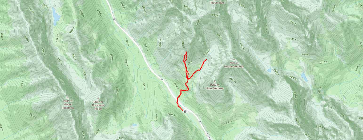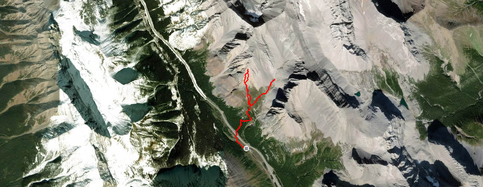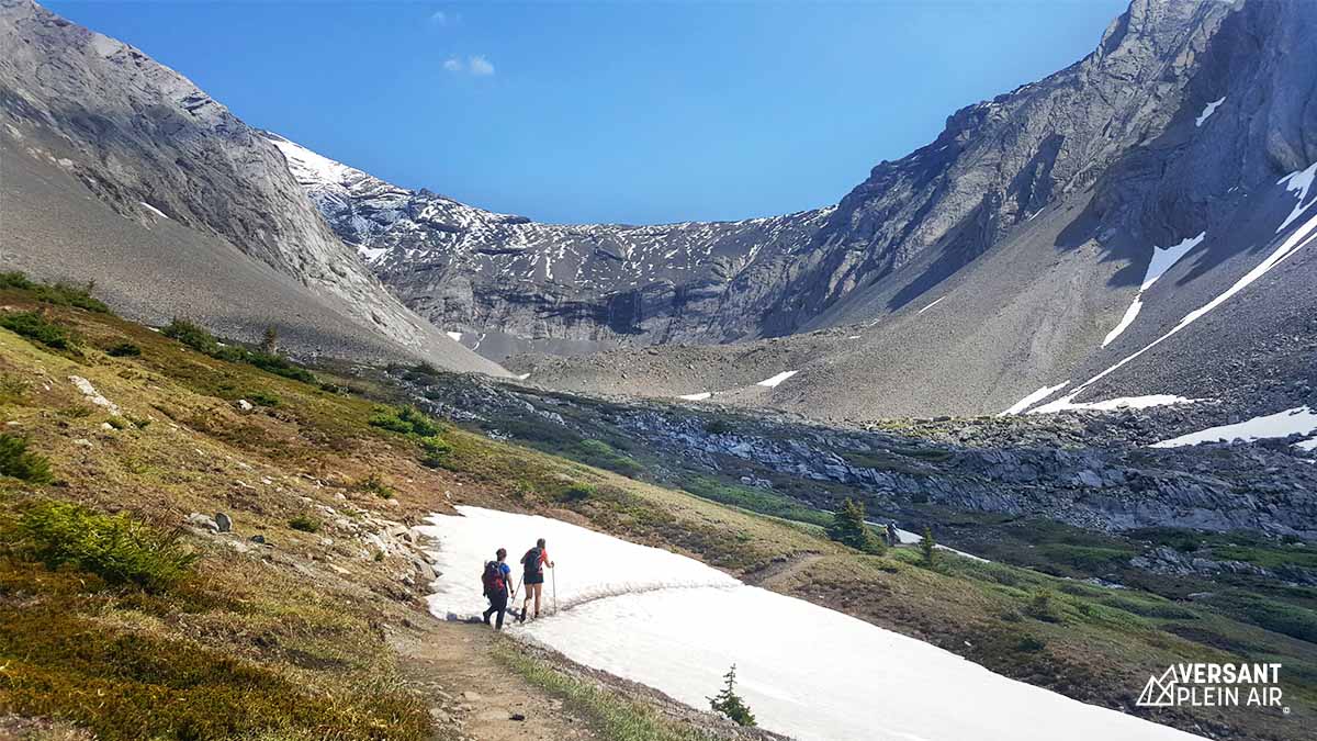 Pour une initiation à la randonnée dans l’Ouest canadien pour un membre du groupe, nous avons choisi Ptarmigan Cirque, dans les Kananaskis. Bien qu’il ne soit pas trop difficile, ce sentier est grandiose. Le départ se fait au stationnement du Highwood Pass (point où l’on y trouve la route pavée la plus haute en altitude au Canada). Il traverse d’abord la route, pour ensuite grimper dans la forêt à l’aide de quelques switchbacks. On dépasse très vite la ligne des arbres, puisqu’on commence très haut en altitude.